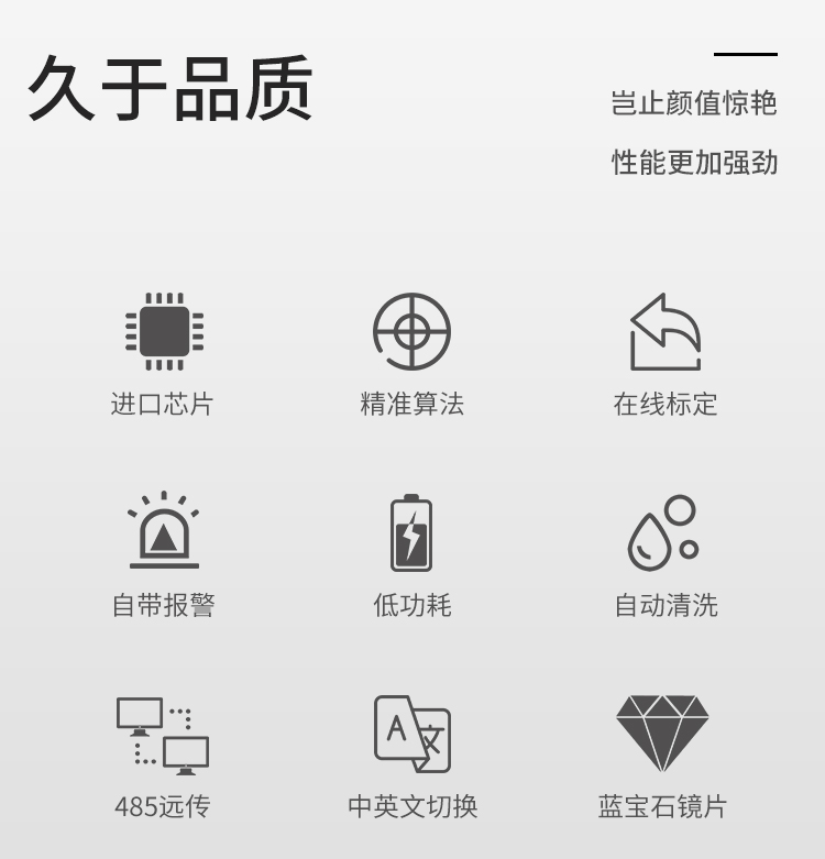 红外双散射光线技术不受色度影响测定浊度值。根据使用环境可以选配带自清洗功能。数据稳定,性能可靠;内设自诊功能,保证数据准确;安装和校正简单。