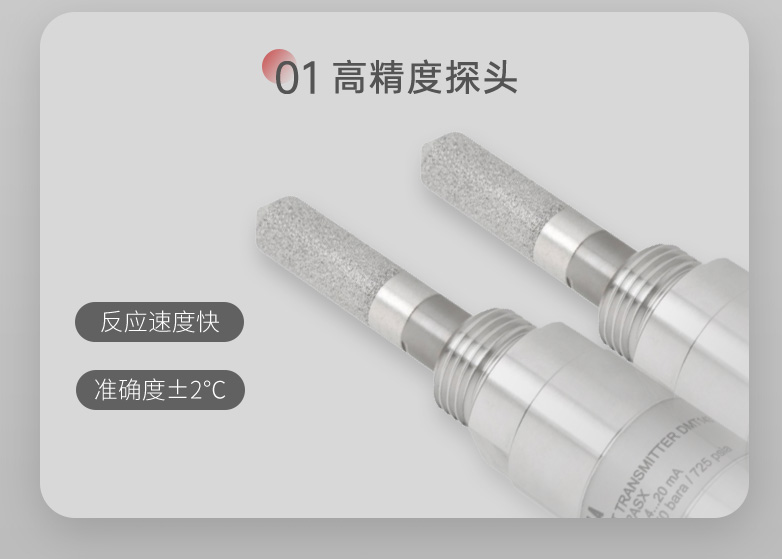 当测量介质的露点温度>-40℃td,高分子电容传感器对比于其他类型的传感器在该区间无论是精准度、响应速度还是长期稳定性均为最优,并且性价比最高; 革新的自校准电路设计,能自动补偿温度、污染、老化引起的电路漂移,提供长期可靠的高精度测量; 创新的温度补偿算法及出厂前多点温度的补偿校验,大大改善了传感器的温度漂移,保证了宽温度范围内的高精度测量。