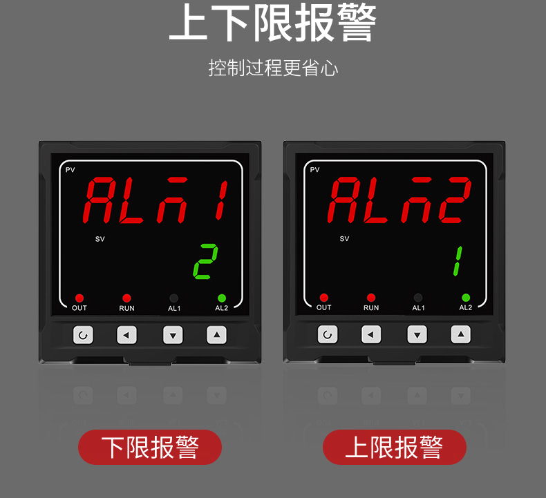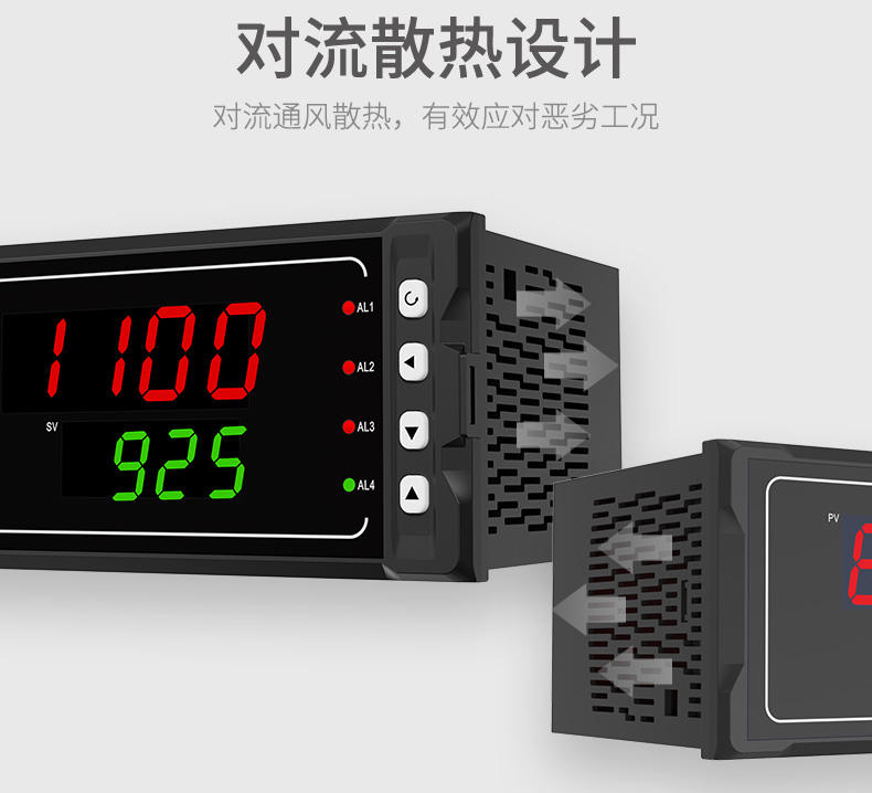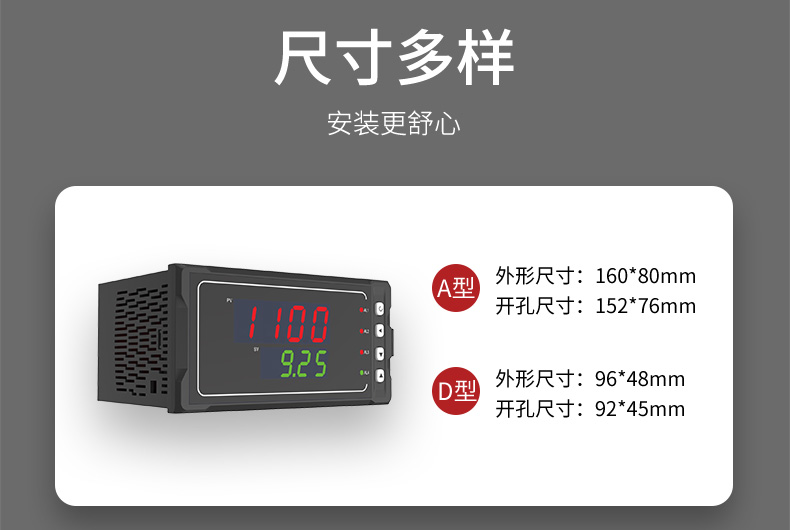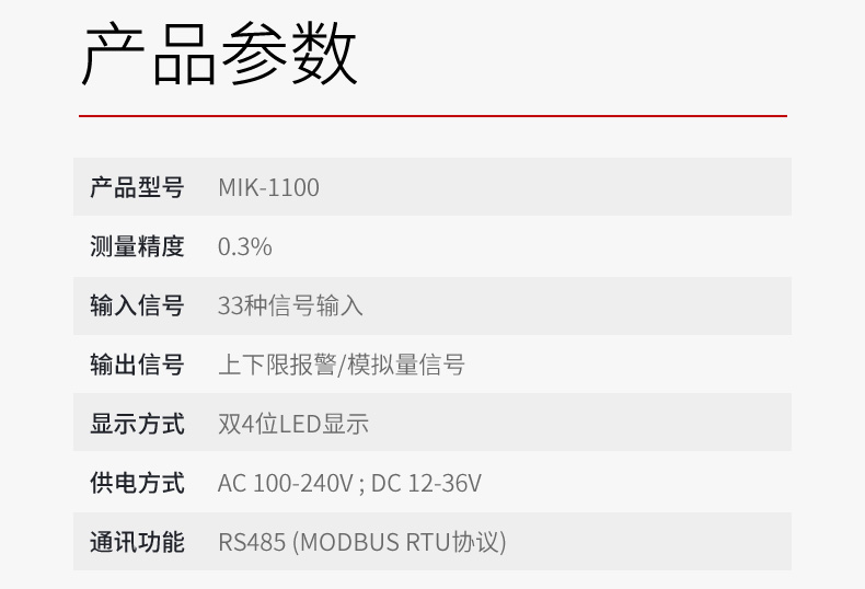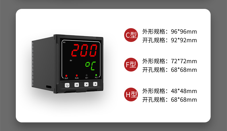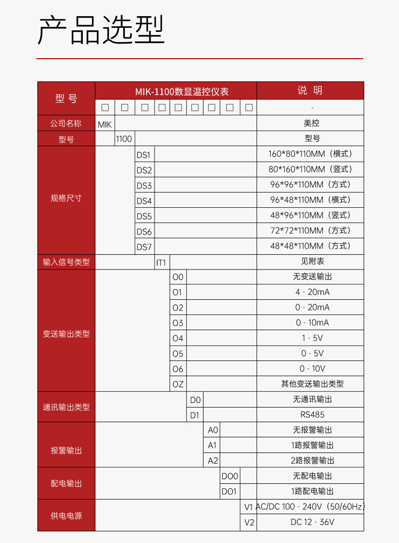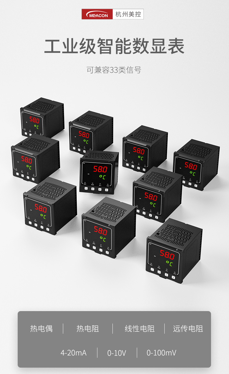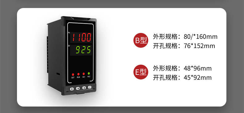MIK1100系列单回路数字显示控制仪(简易型),傻瓜式操作,0.3级测量精度,7款外型尺寸,双四位LED显示,可支持热电偶、热电阻、电压(可开方运算)、电流(可开方运算)及变送器输入,适用温度、压力、流量、液位、湿度等工业过程量的监测。