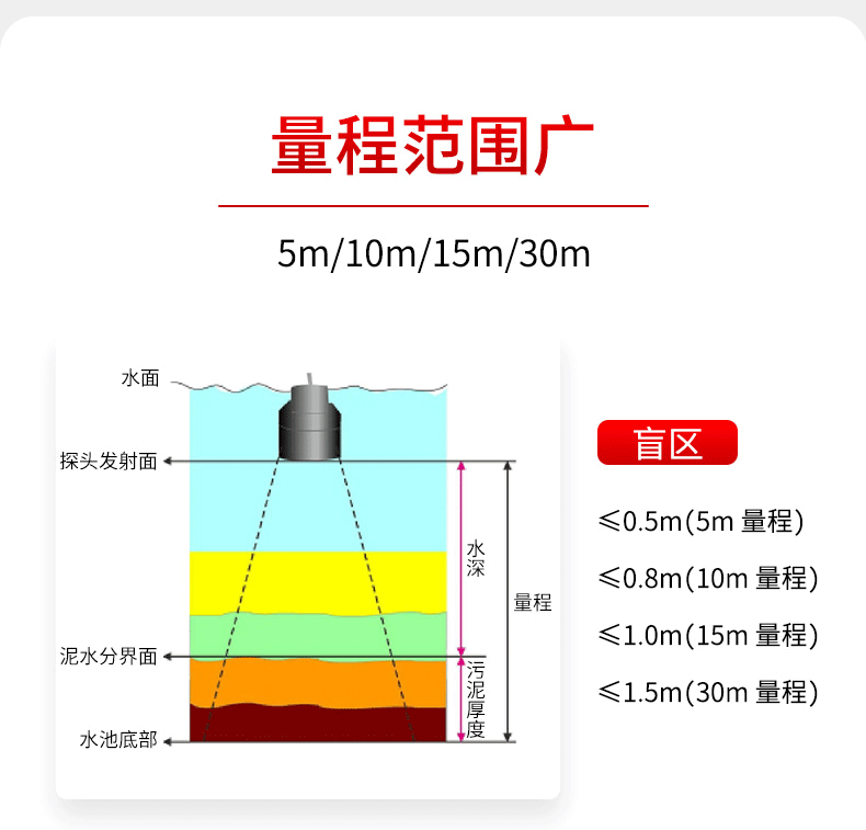 <0.5m(5m 量程)<0.8m(10m 量程)<1.0m(15m 量程) <1.5m(30m 量程)
